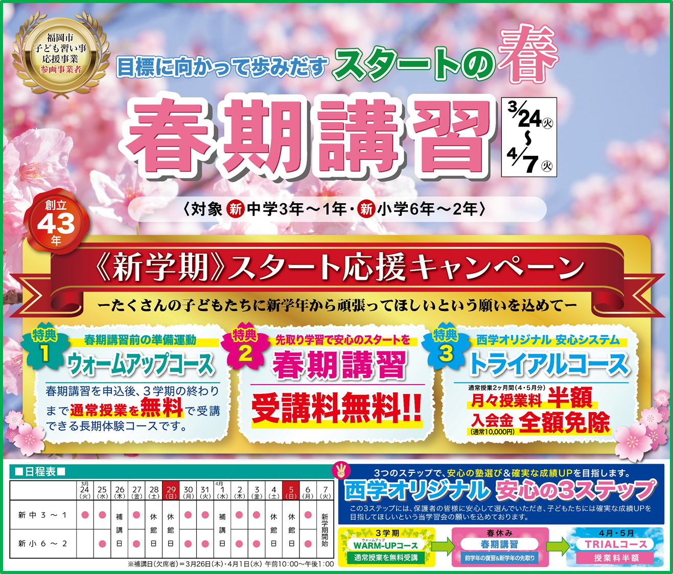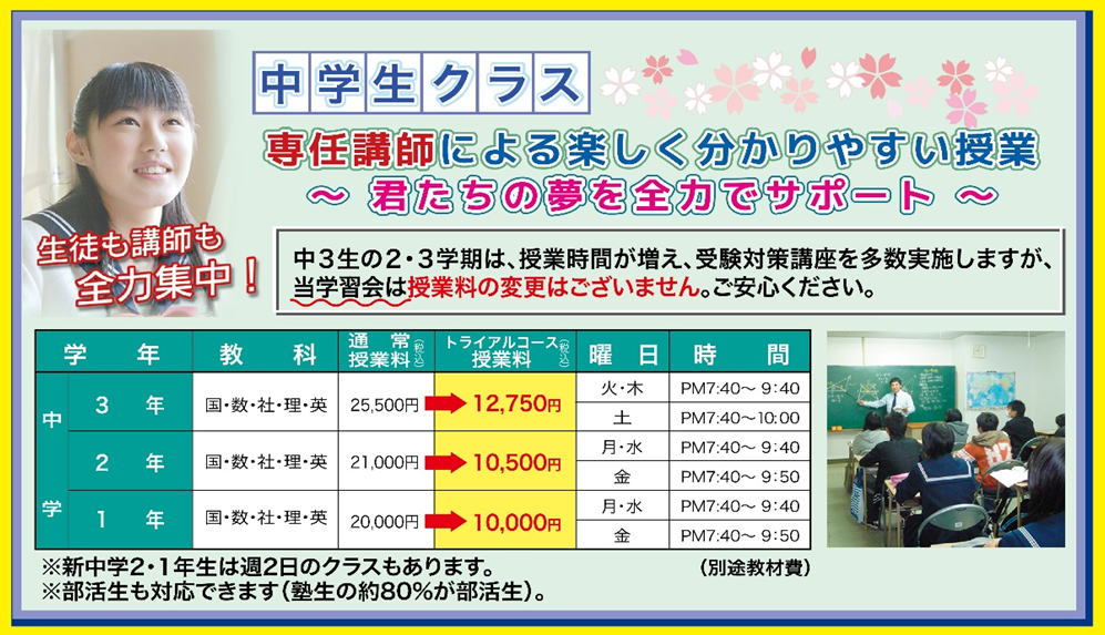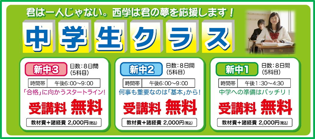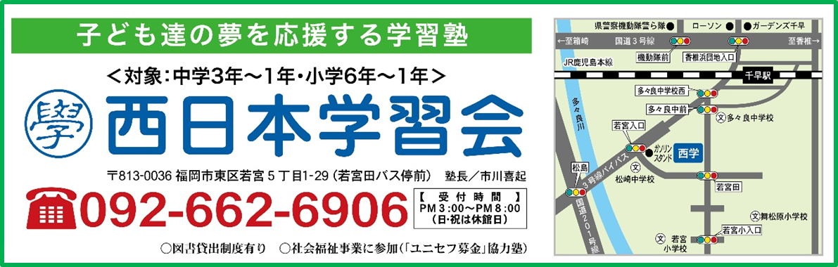 西日本学習会。福岡市東区にある学習塾。対象は中学生(中学3年生〜中学1年生))・小学生(小学6年生〜小学1年生)。無料送迎バスを運行。通常授業以外に、春期講習・夏期講習・冬期講習を実施。良心的費用で、面倒見がよい、信頼できる学習塾。成績向上・高い合格率を誇る学習塾です。